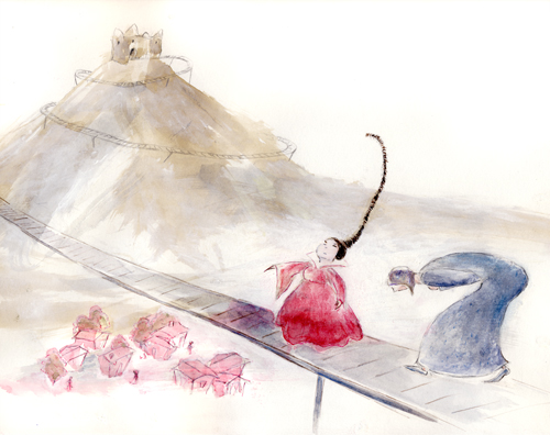"Afin de paraître la plus grande, la reine se coiffait d’un chignon si haut qu’il dépassait la cime des arbres. Ses sujets devaient vivre le dos courbé. Si, par malheur, l’un d’eux se redressait trop, elle l’obligeait à avancer à genoux… " (extrait).