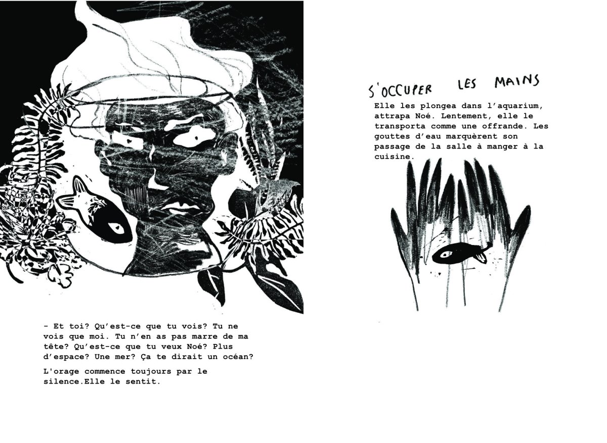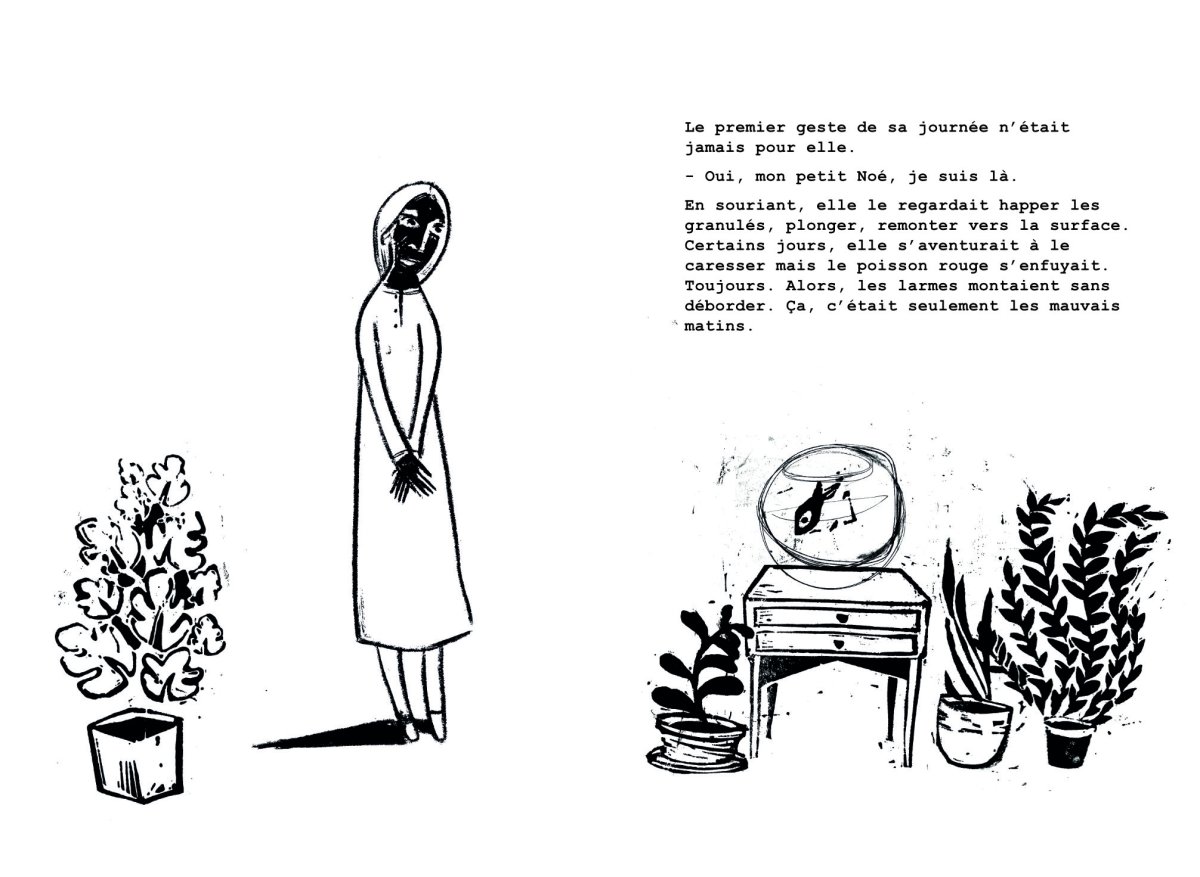 Intitulée « Le Palier », cette nouvelle raconte la routine de la solitude d'une femme. Les gestes répétés, les pensées qui tournent en rond comme le poisson rouge, son seul compagnon. Un poisson qui devient le miroir de sa vie.