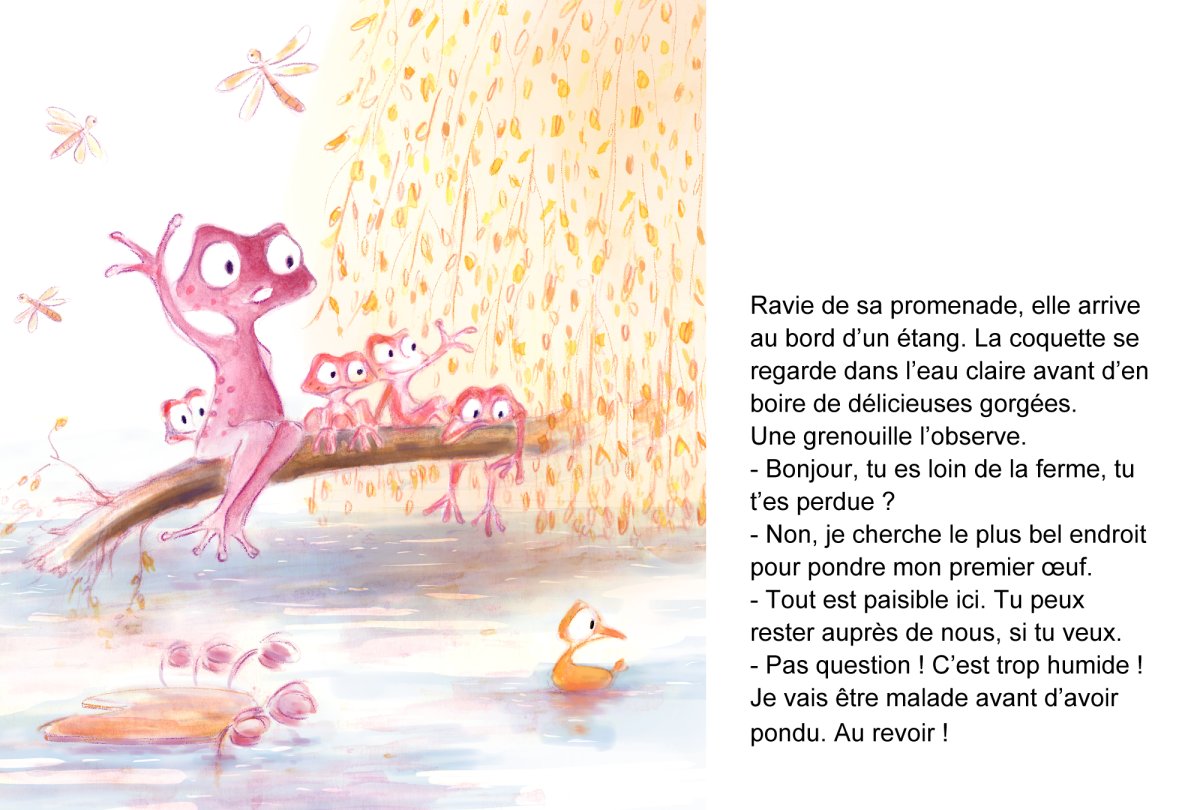 Pas question pour Ginette de pondre son premier dans le poulailler. Ça pue et c’est plein de mouches. Alors elle s'enfuit pour trouver le nid le plus magnifique du monde. Elle trouvera son nid... mais pas du tout celui qu'elle s'imaginait.
